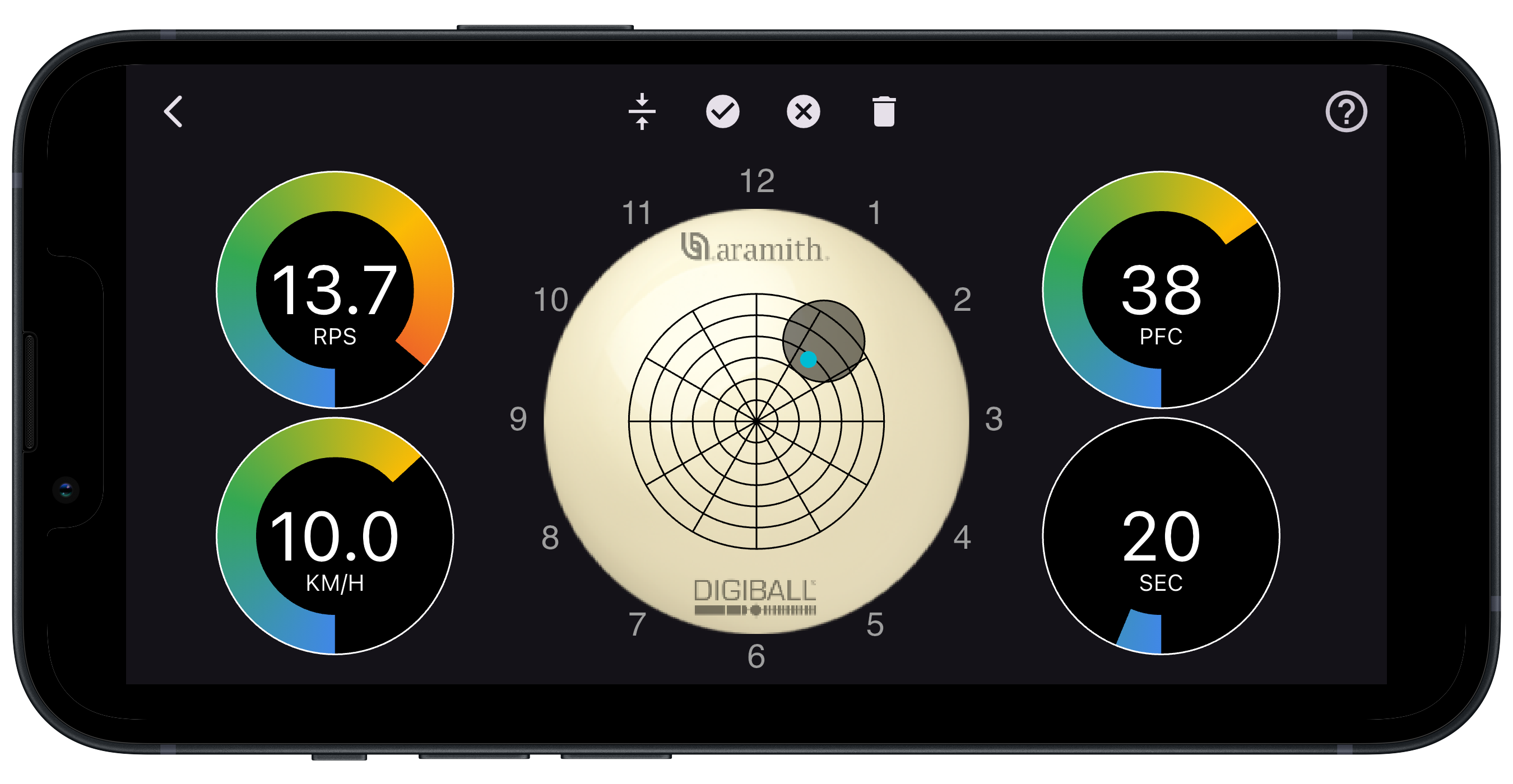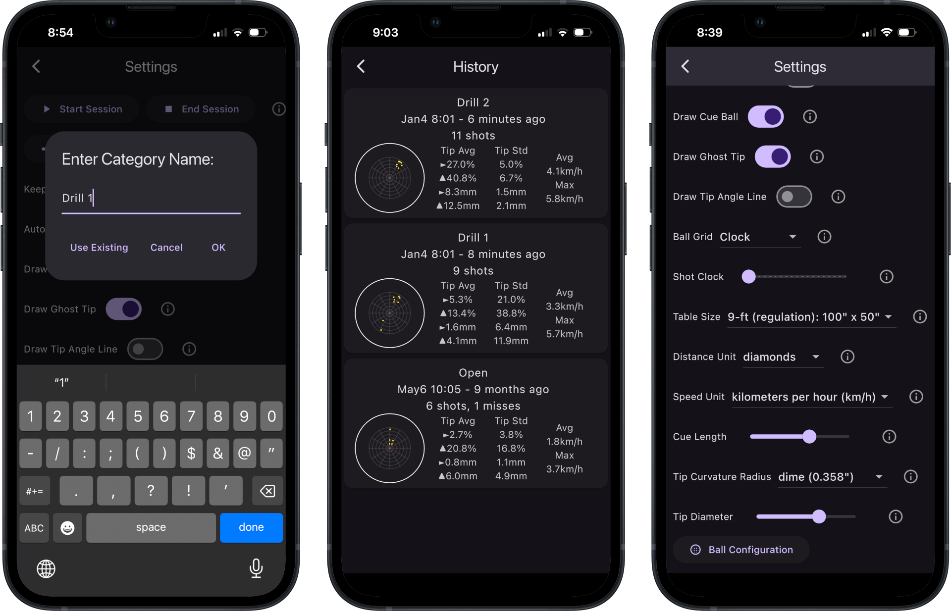 The DigiBall measures the accuracy of your stroke so that you can compare it to your intentions. Novice players may not give any thought to the importance of where on the face of the cue ball they hit it, as long as the cue ball makes the object ball go in the pocket. But for any high level of play, it is extremely important. Hitting the ball too much on one side of center will cause it to deflect in the opposite direction of your aiming line, resulting in a miss. Advanced players know this, and use the deviation in combination with deliberate tip offset to both pocket the object ball and spin the cue ball off of the rails into desired positions. But again, deviations in the accuracy of the deliberate off-center tip hits cause poor results. By obtaining real time feedback on where you actually hit the ball and comparing it to where you intended to hit the ball, you can make permanent adjustments quickly.