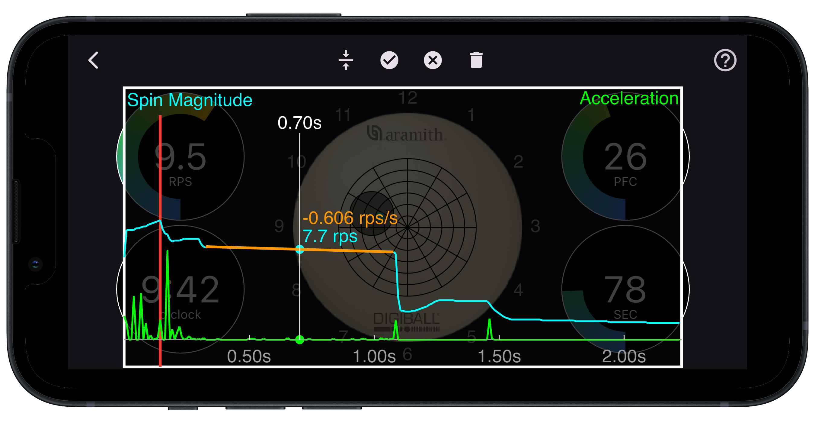 Yes, the DigiBall app displays a plot of spin magnitude over time. The length of time that the DigiBall records data can be configured remotely.