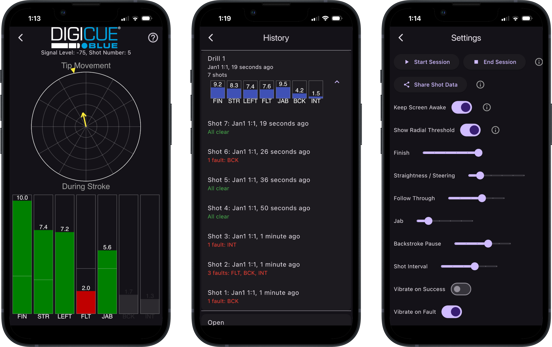 The DigiCue BLUE provides both tactile and visual feedback to help you condition your stroke, track improvements over time, and analyze characteristics and flaws in your execution.